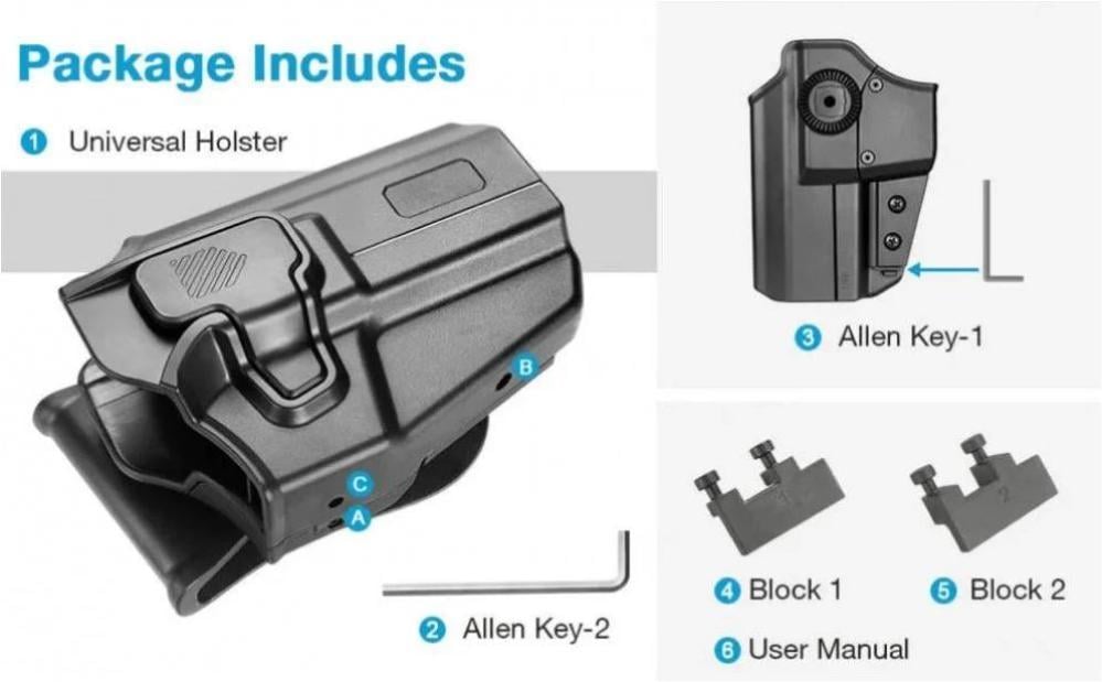جراب عالمي مناسب لأغلب الاسلحة الوسط والكبيرة ويمكن التحكم بالحجم الجراب ليتوافق مع سلاحك الخاص من خلال تعديل مسامير في جوانب الجراب لتناسب أكثر من 150 مسدسًا.