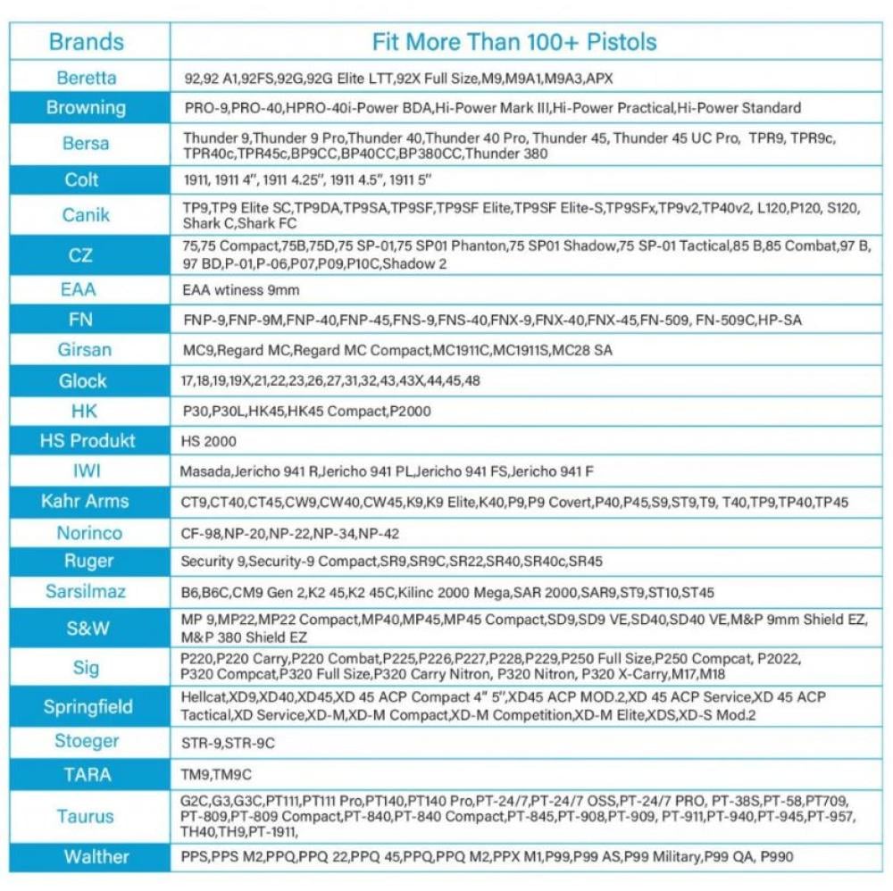 Glock Fits Glock 17 Gen(1,2, 3, 4, 5), Glock 19 Gen(1,2, 3, 4, 5), Glock 19X, Glock 21, 22, 23, 26, 27, 30, 31, 32, 33, 34, 35, 36, 41, 43, 43X, 45.