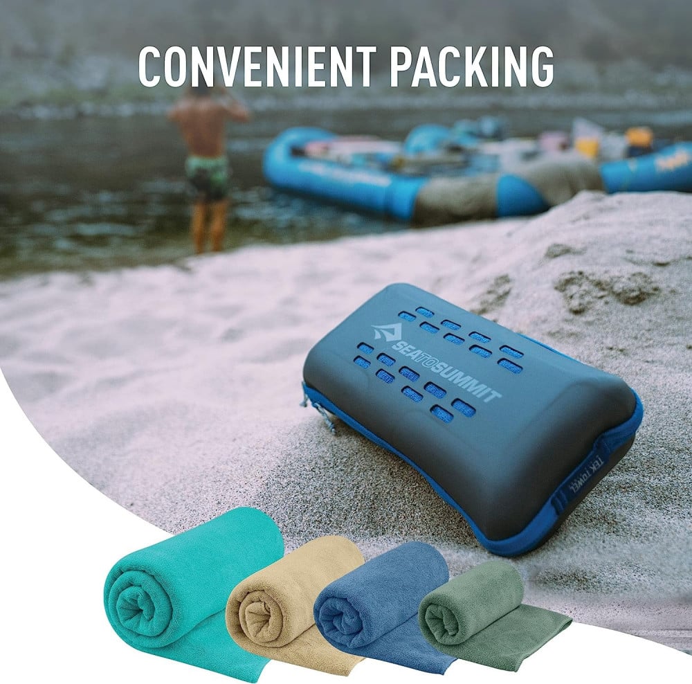 منشفة من شركة sea to summit الاسترالية، صغيرة الحجم وناعمة، مصنوعة من نسيج حريري الملمس يمتص 3 أضعاف وزنه من الماء وسريع الجفاف وقابلة للغسل، تأتي بعلبة حافظة.