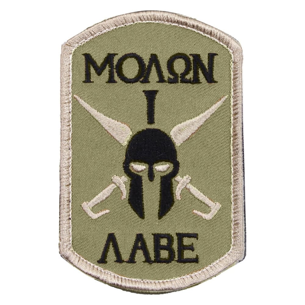 كيف تتخلص من المتقشف الذي بداخلك مع روثكو مولون لاب باتش ؛ تعرض نص "Molon Labe" مطرزة وصورة خوذة وسيف.