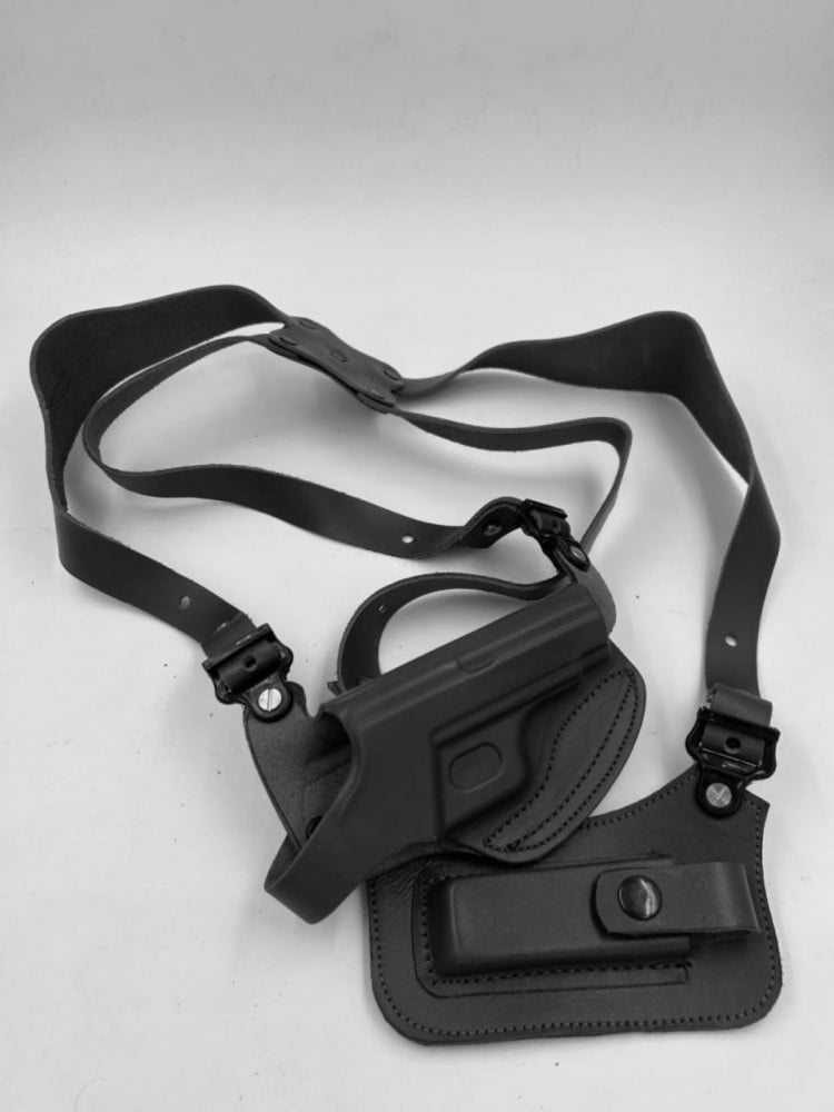 Genuine leather shoulder pouch suitable for Glock 9mm pistol with one magazine.Available in dark brown and black.The product is handmade in pakistan